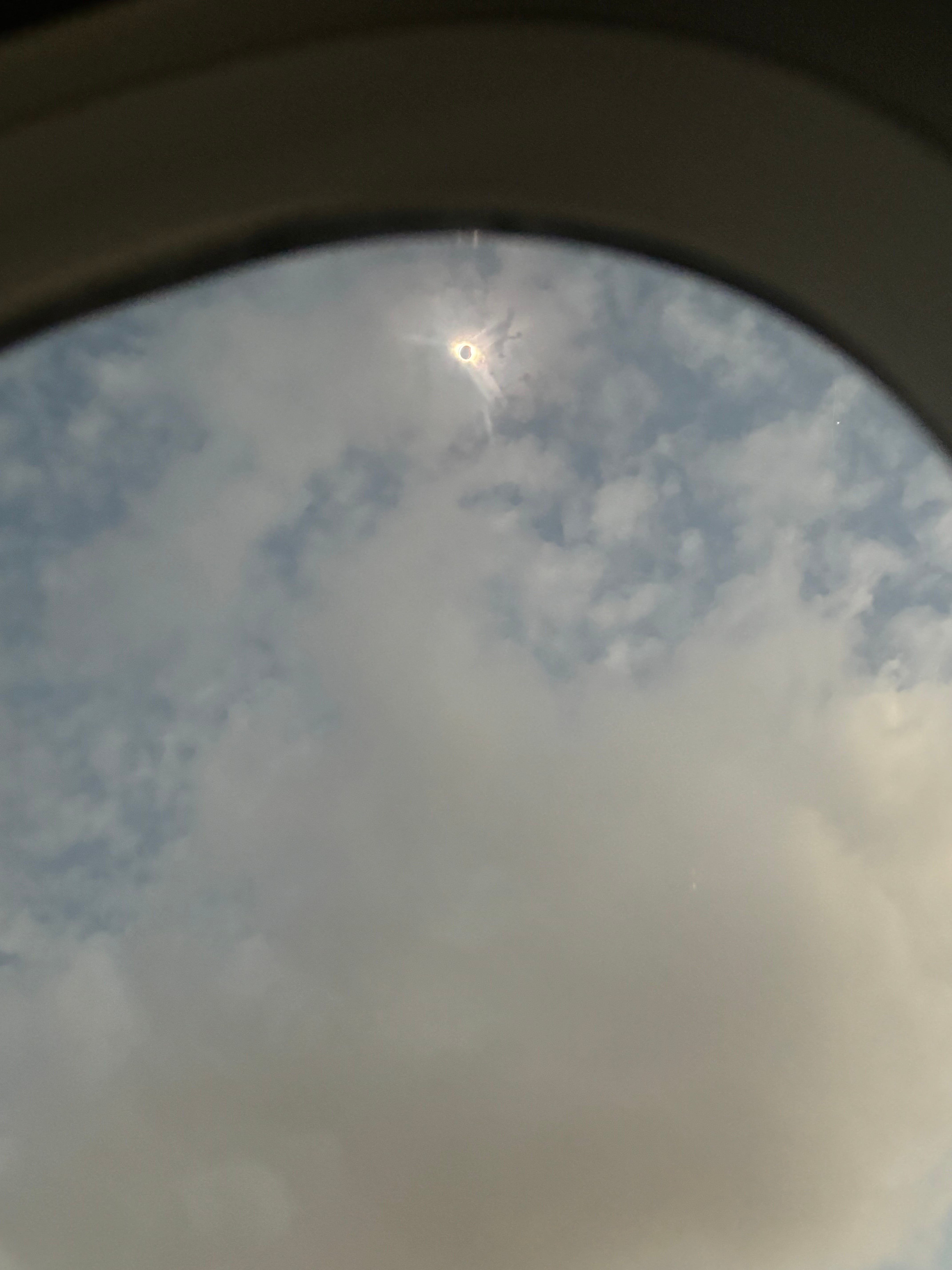 We didn’t have eclipse glasses, not having expected to be in the eclipse, so I discouraged her from staring, although the plane window panes did seem to help. Above us, the sun blackened out by the moon. Around us, midday darkness.