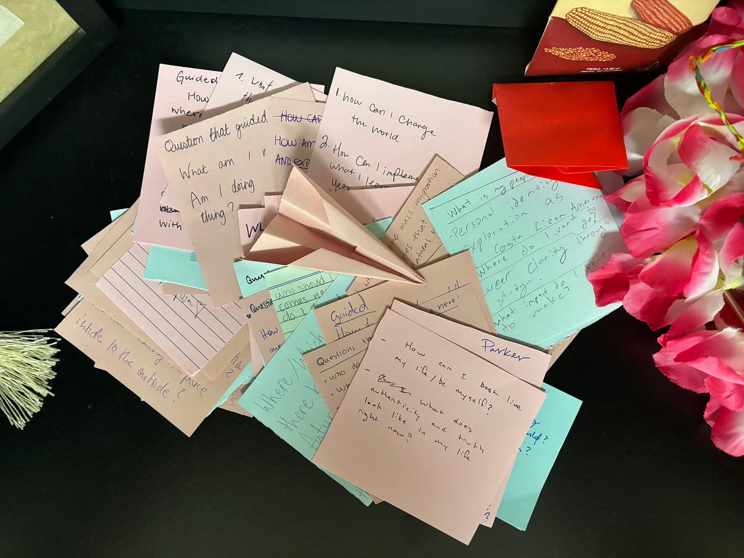 In September, when I offered my foundations class lecture to the UPEACE class of 2025, I asked them to write on slips of paper the question that had led them to UPEACE or the question that was alive in their learning, which they then brought up to place on the learning altar. As they set them down, I read them and I thought, “This is like an oracle deck!” I have kept them on my office altar ever since.